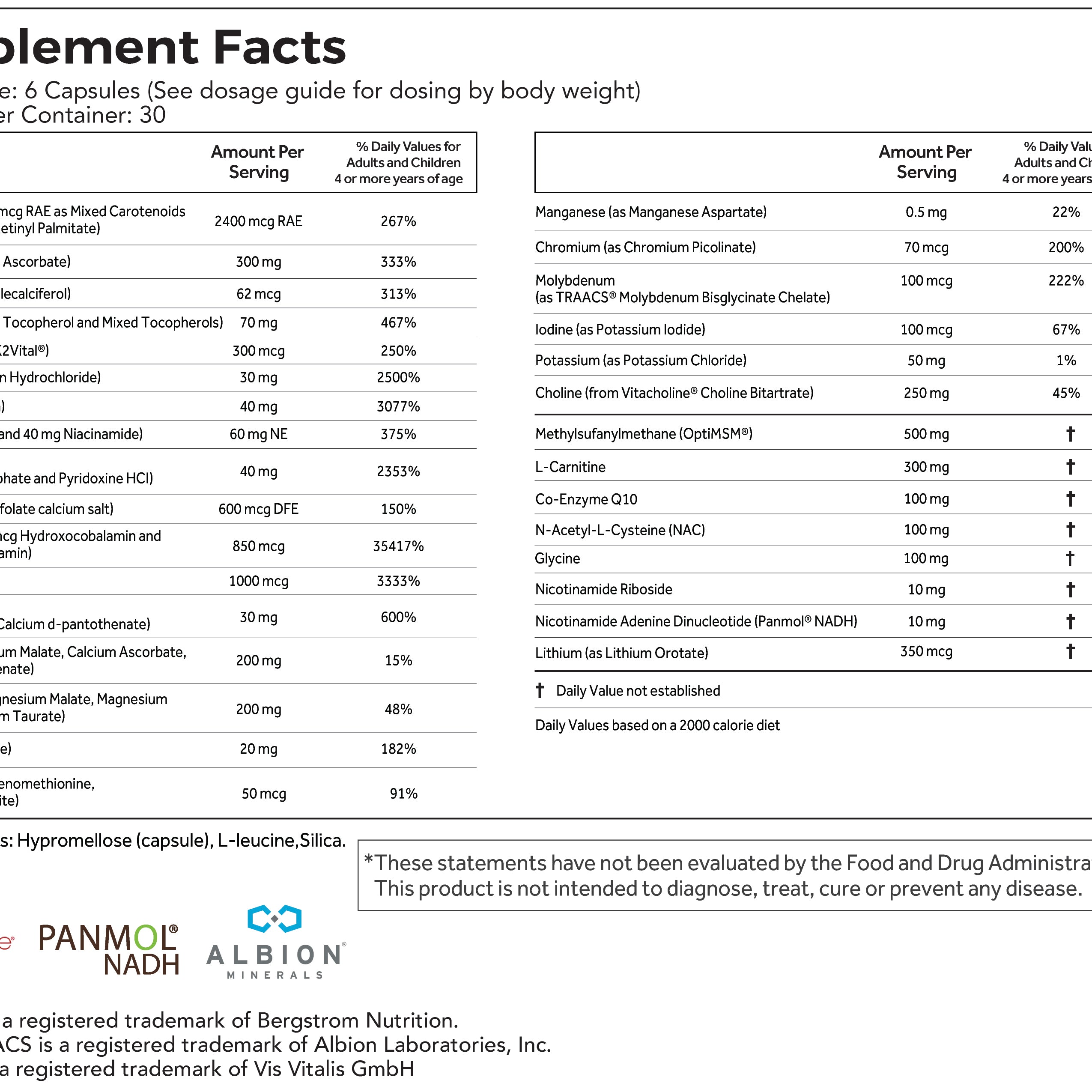 A supplement facts label lists vitamins, minerals, and other ingredients per serving, with daily values indicated.