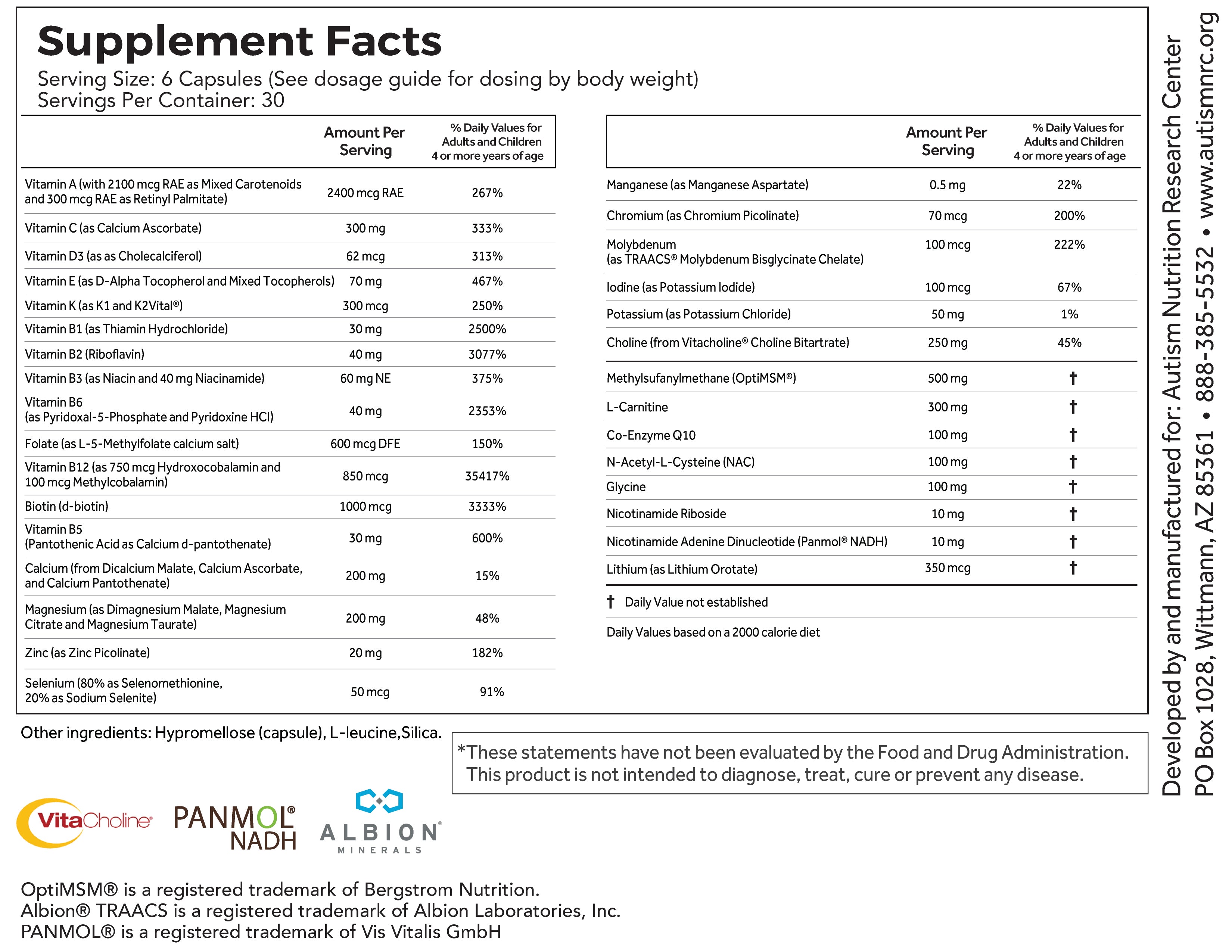 The Autism Nutrition Research Center’s guidelines are designed to provide optimal nutritional support for most children and adults with autism. It includes a comprehensive set of vitamins, minerals, essential fatty acids, l-carnitine, and a healthy allergen-free diet. The ANRC Guidelines are based primarily on several major research studies and clinical trials conducted by Prof. James Adams at Arizona State University, as well as studies by many other researchers around the world. In just 120 days, the ANRC Guidelines will provide comprehensive nutritional support, to maximize brain and body function.